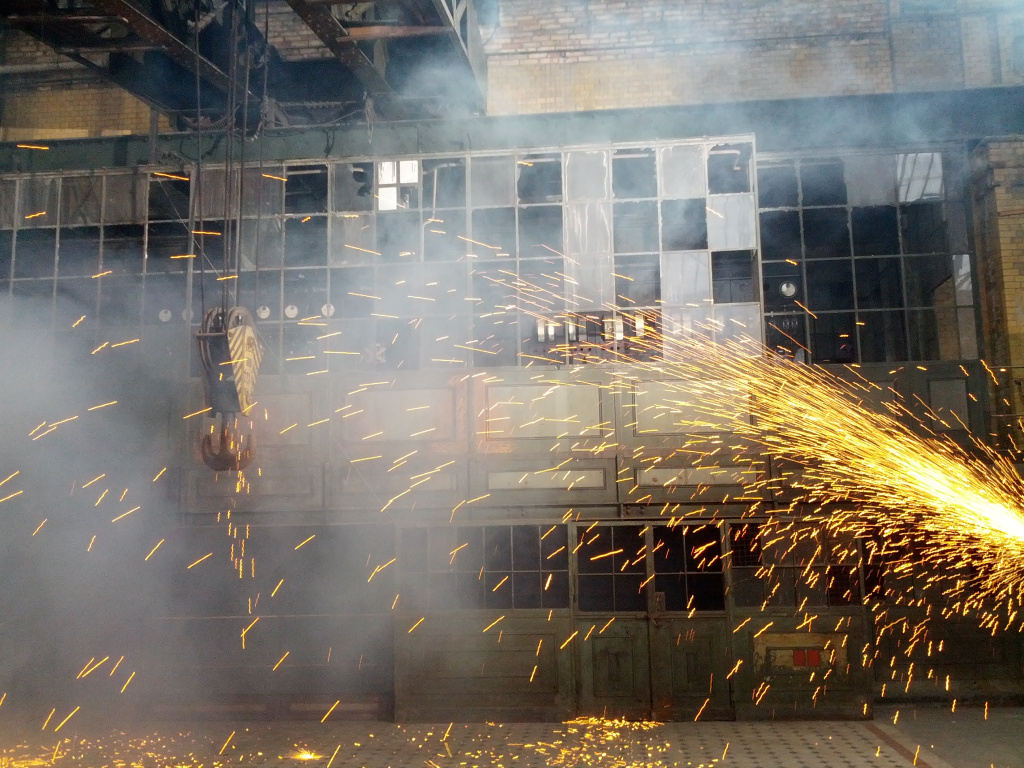 Sparks are typically produced on-set by pyrotechnical devices or akward constructions requiring technicians holding pieces of steel against rotating grinding discs.
